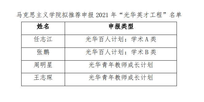 根据学校《关于开展2021年“光华英才工程”申报工作的通知》的要求,beat365官方网站严格遵照申报标准及程序,在老师个人申报基础上,经学校相关部门认定成果、学院党总支委员会政治把关、学院教授委员会、党政联席会研究决定,拟推荐任志江等4位老师参加学校“光华英才工程”项目评选。